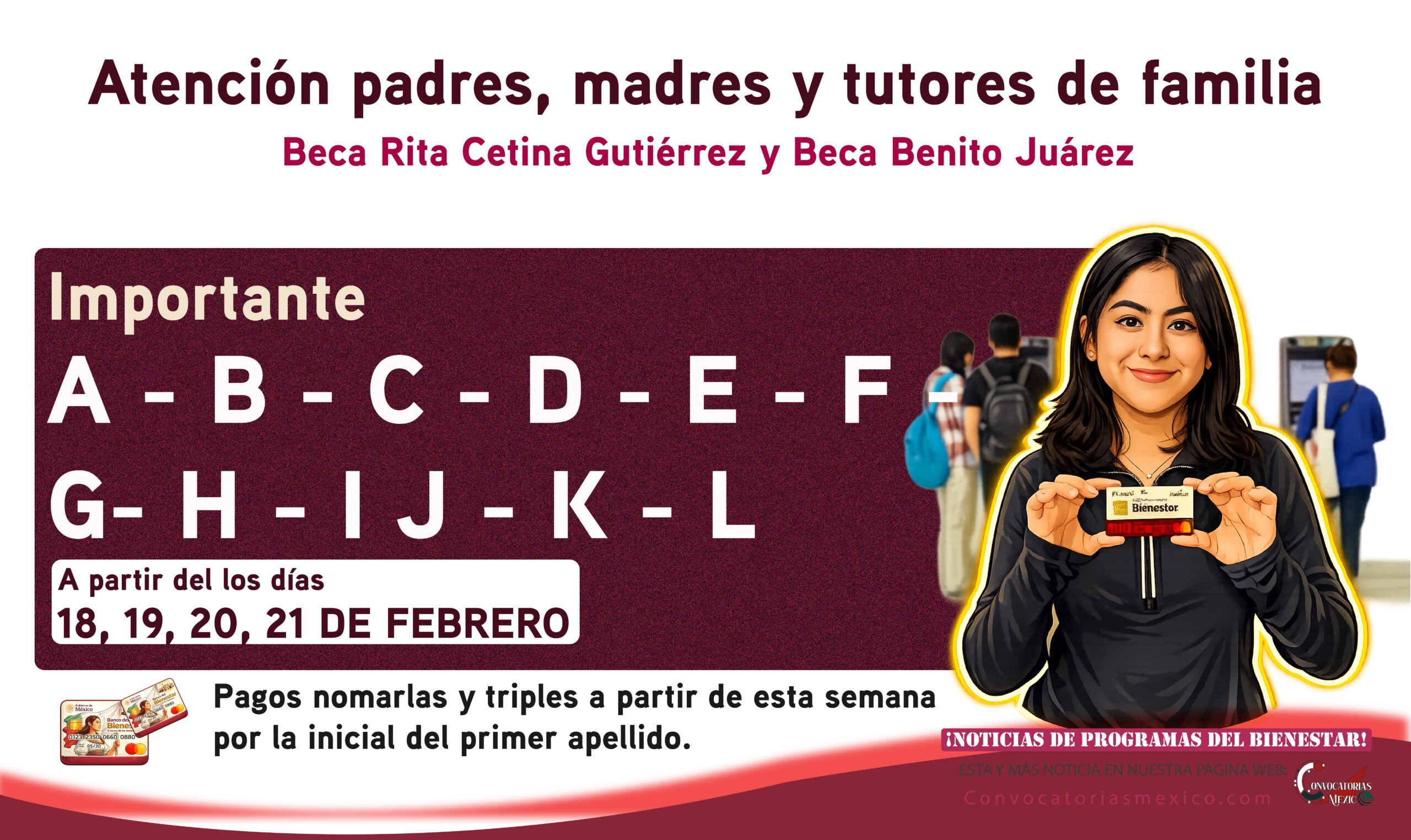 Este calendario se publicó como oficial para el pago de febrero, bimestre enero–febrero de la Beca Rita Cetina, y el esquema de dispersión es el mismo estilo que la CNBBBJ suele manejar, por letras, escalonado.