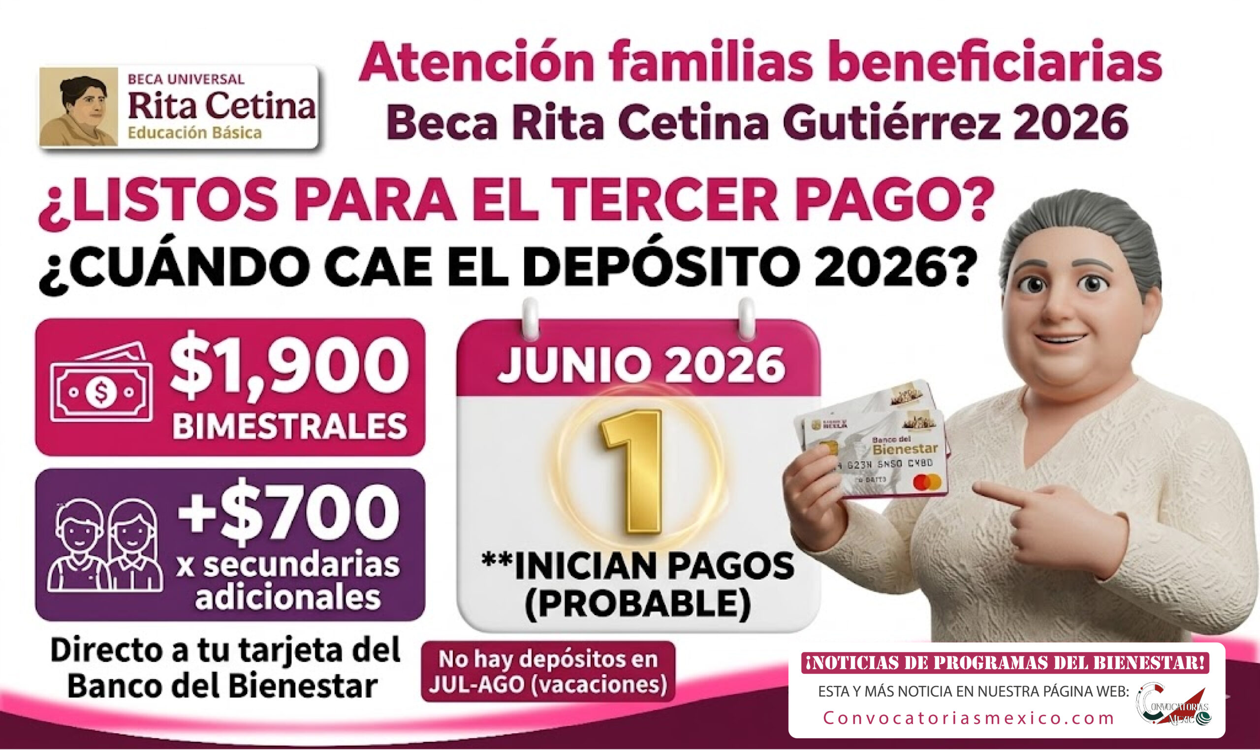 Muchas familias ya están preguntando por el tercer pago de la Beca Rita Cetina Gutiérrez 2026, que corresponde al bimestre mayo-junio. Aunque todavía no se ha publicado el calendario oficial de ese operativo, la fecha más probable para que inicien los pagos es el lunes 1 de junio de 2026.
