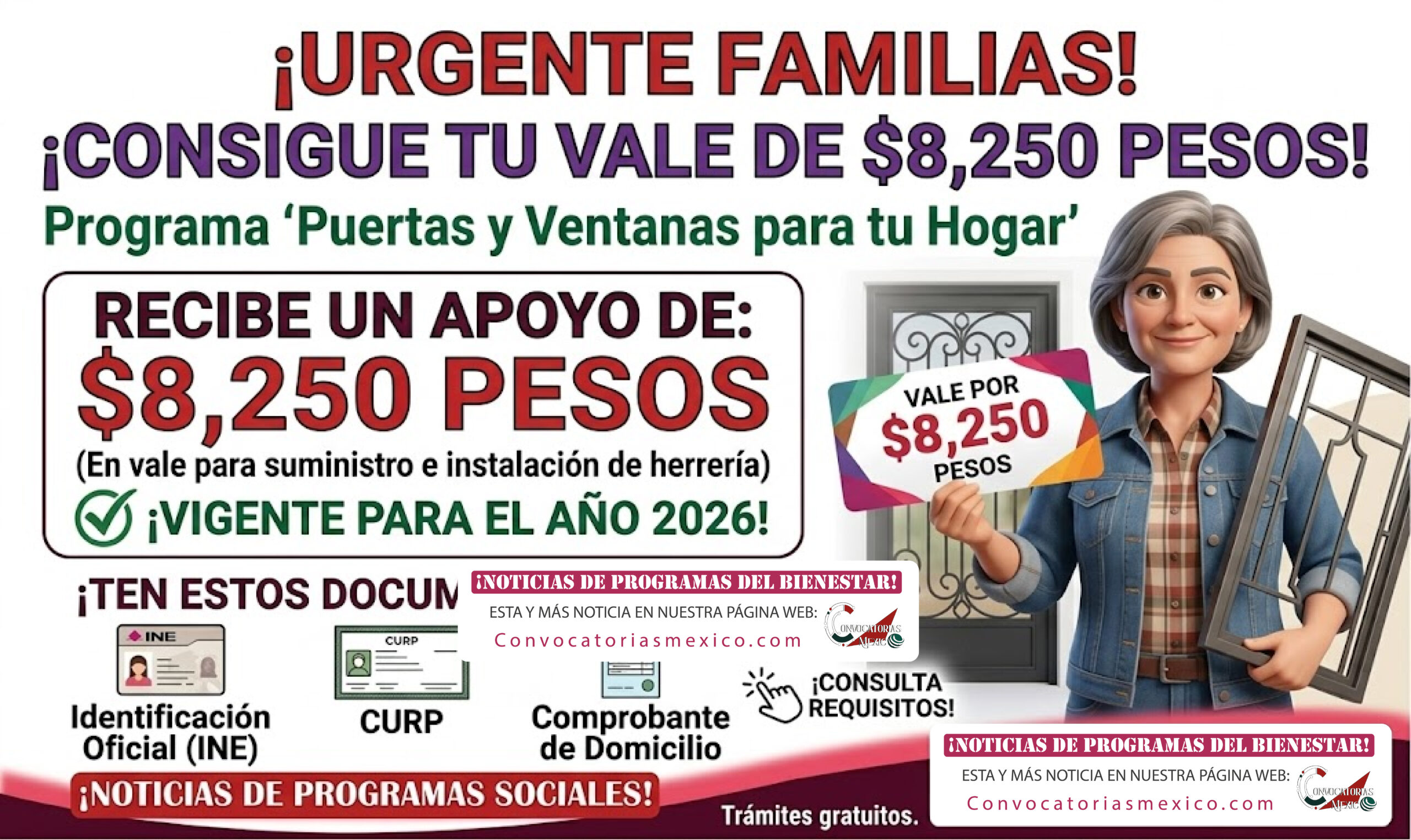 Para las personas beneficiarias de la vivienda, el apoyo se maneja como un vale por 8 mil 250 pesos, destinado al suministro e instalación de puertas y/o ventanas de herrería. Esto significa que la ayuda está pensada para mejorar la casa con la colocación del material, no como un depósito libre para gastar en otra cosa. Las reglas también señalan que, si el trabajo supera ese monto, la persona beneficiaria tendría que cubrir el costo excedente.